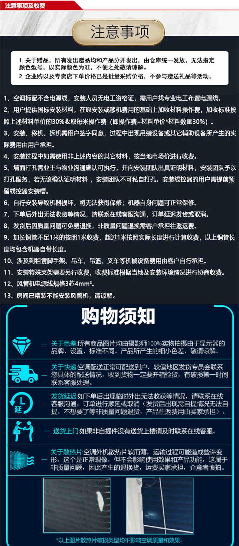 如安装产生额外材料费用时,我们将酌情收取成本费用,其中机架30元/付,加管视空调类型收取70-200元/米不等费用