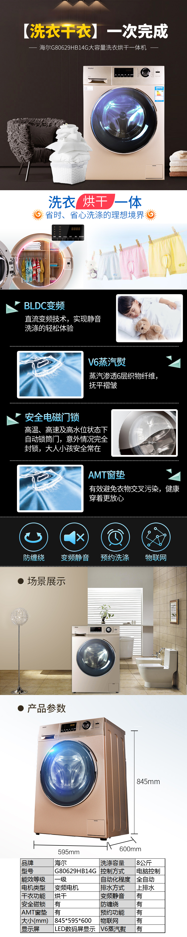 海尔(Haier) 8公斤带烘干上排水滚筒全自动洗衣机G80629HB14G